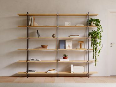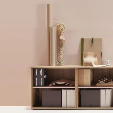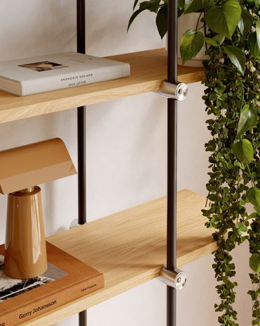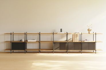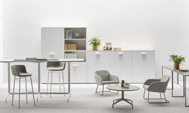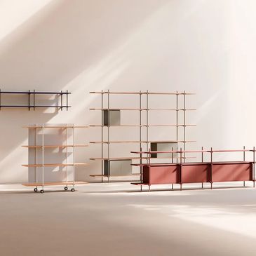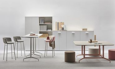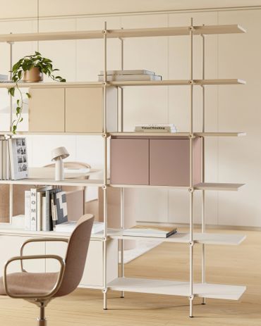 Med en alsidig konfiguration giver det modulære reolprogram Hika mulighed for at skabe både individuelle og fælles mikrouniverser i arbejdsområder.